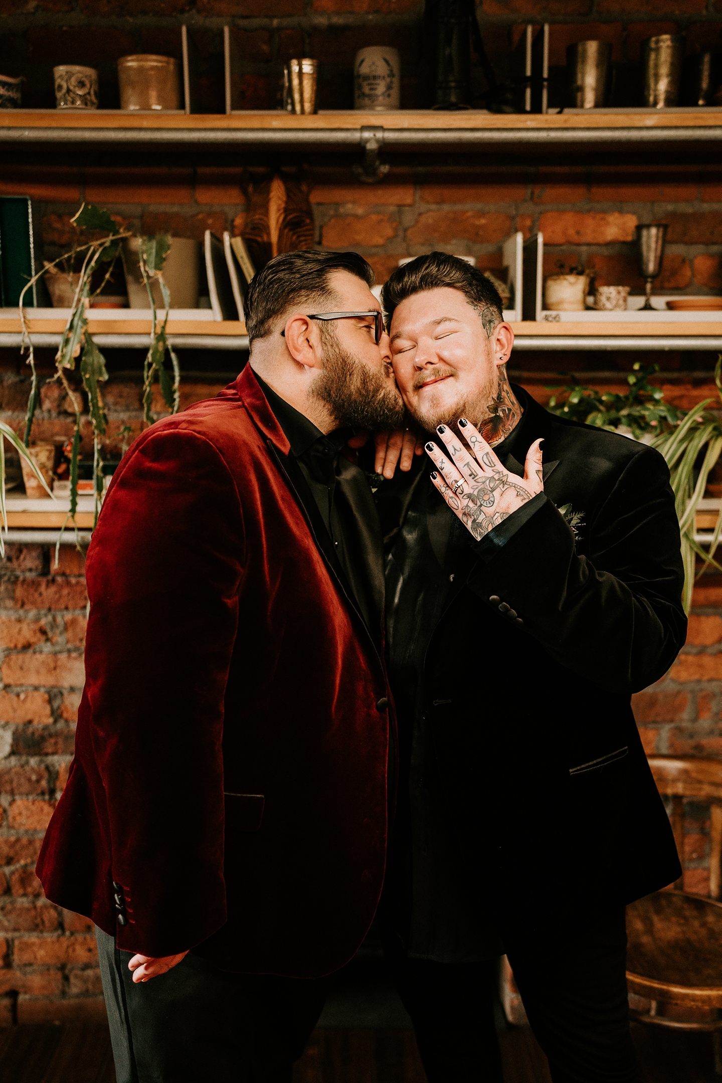 In a departure from tradition, we embraced outfits that felt intimately “us.” My partner Steve looked handsome in red velvet, regal and warm, a perfect reflection of his vibrant personality. I wore black velvet with blue accents, a subtle nod to the midnight sky that had inspired so much of our day. Every element, no matter how small, was chosen to show not only our celestial theme but also the individuality and love we bring into our shared life. Our shoes carried personal touches, etched with roses, they were a quiet nod to our story, a symbol of beauty and resilience. Together, we felt authentically ourselves, a celebration of individuality on a day dedicated to unity.