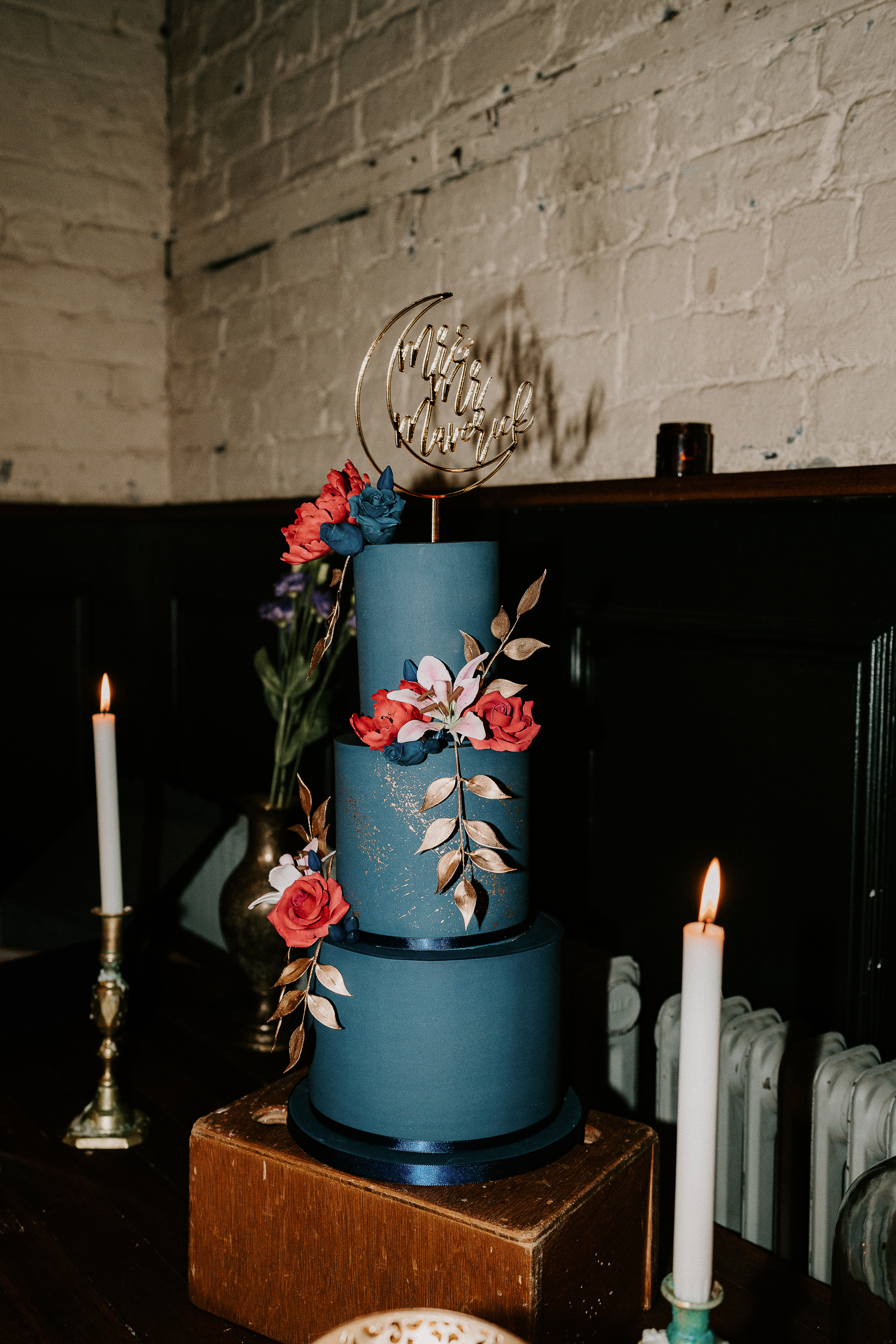 We wanted every detail to echo the magic of the cosmos. Single-stem flowers rested elegantly on each table, illuminated by gold moon lamps that cast mesmerizing shadows, evoking the mystery and beauty of the night sky. The colours, rich midnight blue, shimmering gold, and deep burgundy were woven through every detail, from the midnight blue cake scattered in gold with beautiful hand crafted roses and lilies, the banners adorning the walls, to the accents in our outfits.
