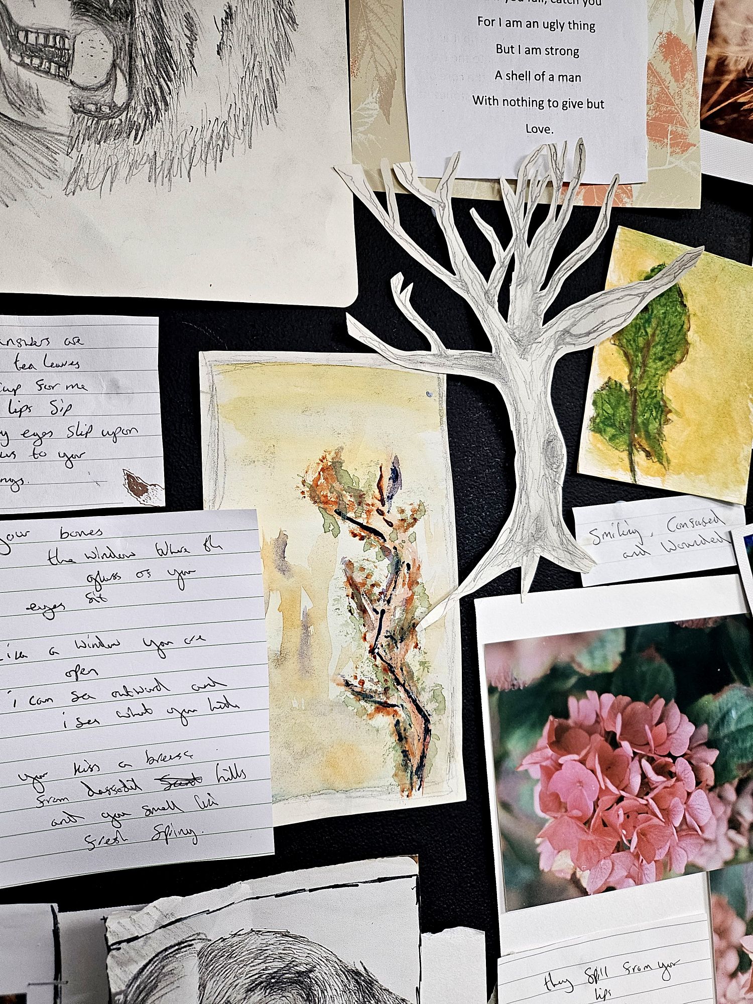 I wanted to create an experience that reflects not just the words I write but the world I live in while writing them. That’s why you’ll hear the soft sound of birdsong as you stand inside the exhibition, why the floor is scattered with real autumn leaves, and why my poems are presented alongside fragments of my creative process. Love, after all, is something we live in, walk through, and sometimes lose ourselves inside.
